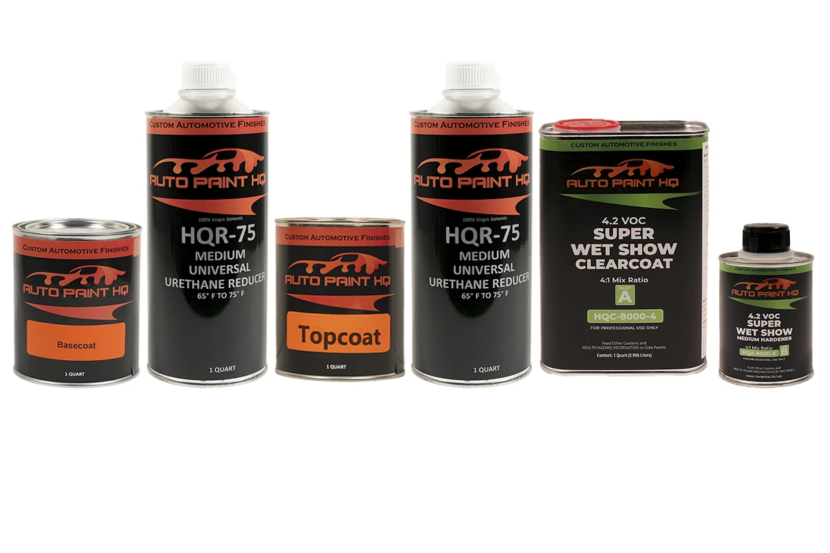 The Peach Base Color mixes 1:1 with the reducer making 2 Quarts of sprayable Base. The Mother of a Pearl Color mixes 1:1 with the reducer making 2 Quarts of sprayable Pearl. The 4:1 mix ratio Super Wet Show Clear Kit makes 1-1/4 quarts of sprayable Clear.